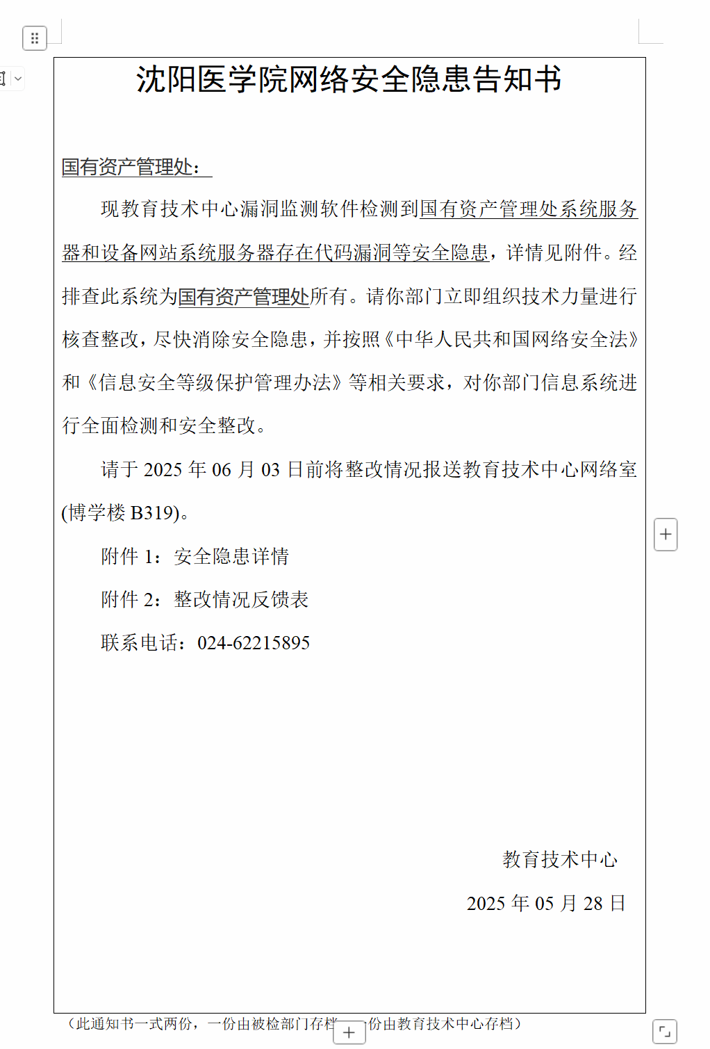 5 月 27 日,沈阳市委网信办检查发现国有资产管理处资产管理系统存在漏洞等安全隐患;5 月 28 日,教育技术中心发出《网络安全隐患告知书》,要求部门于 2025 年 6 月 3 日前完成核查整改并报送情况。